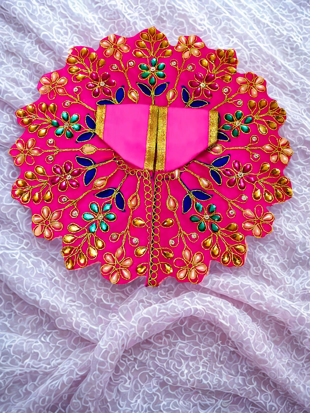 Elegant handcrafted Kanha Ji Dress / Vastra, beautifully designed in vibrant pink fabric with colorful floral embroidery, golden zari work, and shimmering embellishments. The round pattern with delicate detailing makes it perfect for adorning your beloved Kanha Ji during pooja, festivals, and special occasions.
