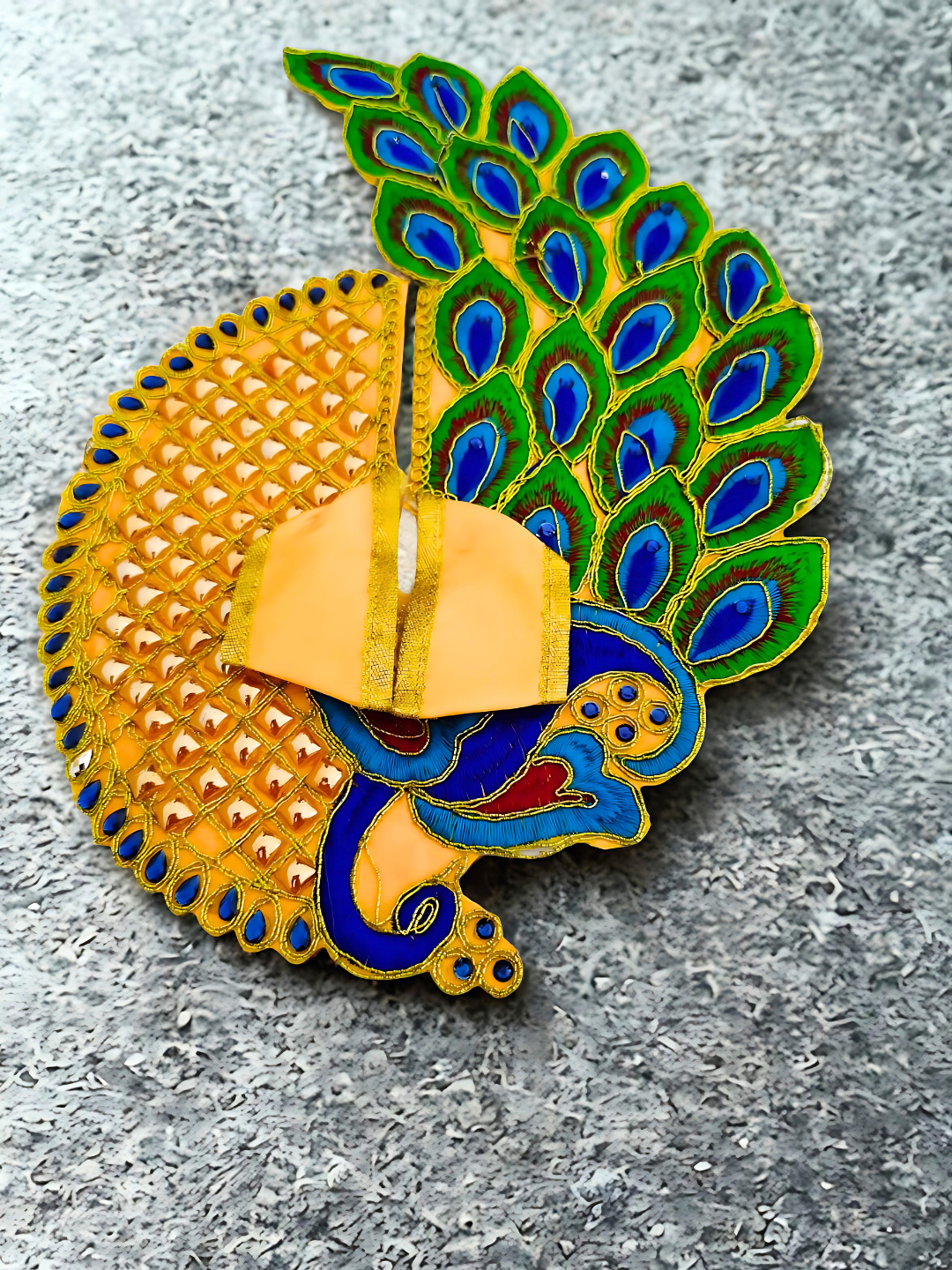 Magnificent handcrafted Kanha Ji Peacock Dress / Vastra, designed with vibrant peacock feathers motif in shades of green, blue, and golden yellow. The dress is adorned with fine embroidery, mirror work, and zari detailing, making it a perfect choice for festive occasions, Janmashtami, or daily darshan.