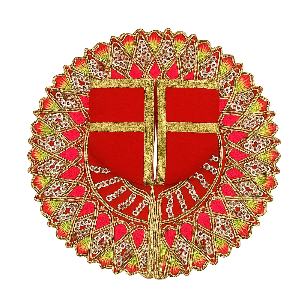 Enhance the divine beauty of your Laddu Gopal Ji with this elegant and traditional poshak. Made with premium fabric in rich red color, adorned with golden lace and colorful embroidery, this dress is perfect for daily wear as well as festive occasions. The intricate design reflects devotion and artistry, making it a graceful offering for your deity.